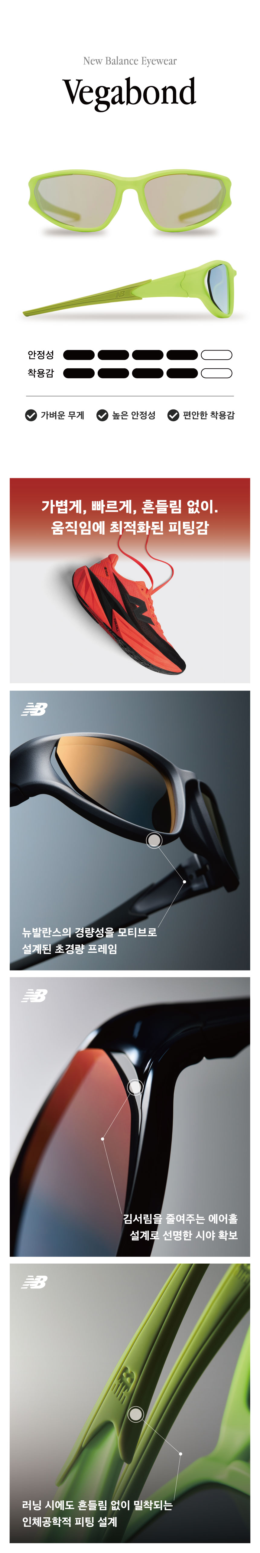 뉴발란스의 2025년 컬렉션에서 새롭게 공개된 베가본드 모델은 더욱 스포티한 디자인과 극도로 가벼운 무게로 완성되었습니다. 고글에 가까운 쉐입과 실리콘 팁 디테일이 안정적인 착용감을 제공하며, 역동적인 움직임 속에서도 흐트러짐 없이 눈을 보호하는 기능성을 갖춘 모델입니다.